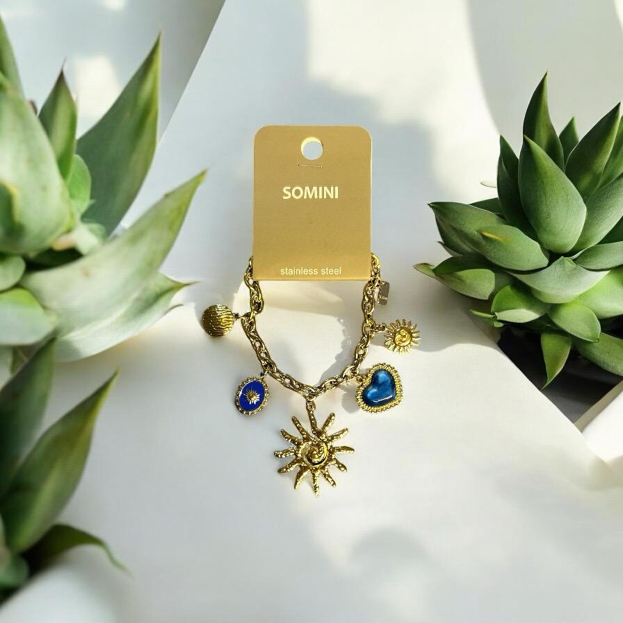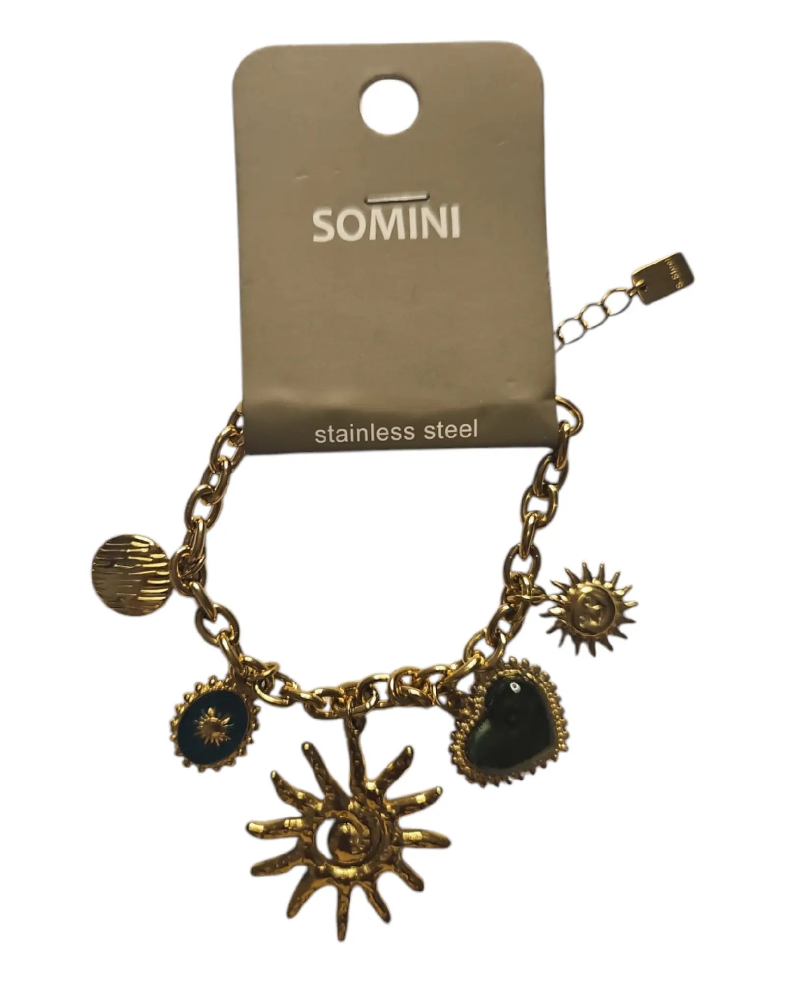 Un bijou solaire et bohème en acier inoxydable doré, orné de charms uniques : grand soleil, petits astres, médaillon martelé et cœur vert. Résistant à l’eau et hypoallergénique, il apporte éclat et originalité à tous vos looks.